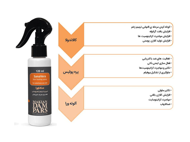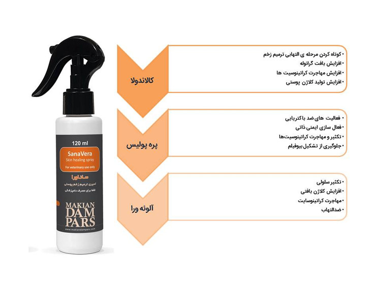 ساناورا اسپری صد در صد طبیعی و ترمیم کننده ی انواع زخم ها و التهابات پوستی در حیوانات خانگی و پرندگان زینتی است. ترکیبات موثره اصلی این محصول شامل عصاره های کالاندولا (همیشه بهار)، آلوئه ورا و پروپولیس است. این ترکیبات داراي خواص گسترده ضد التهابي، ضد باكتريایی، ضد قارچي و آنتي اكسيدانی بوده و با تقويت سيستم ايمنی، تحريک سنتز كلاژن و افزايش اپيتليزاسيون، انقباض ناحيه زخم و تشكيل بافت گرانوله موجب تسريع روند بهبود زخم می شوند. به علت وجود عناصر آنتی اکسیدان مانند فلاونوئیدها و پلی فنول ها در گیاه همیشه بهار، باعث کاهش GST، SOD و CAT و بهبود قابل توجه استرس اکسیداتیو ناشی از جرب سارکوپتس می شود. همچنین عصاره همیشه بهار باعث ترمیم زخم و بافت با ایجاد حداقل اسکار در زخم های عفونی بزرگ و سوختگی ها می شود. گیاه آلوئه ورا با افزایش تولید گلبول قرمز و نفوذ گلبول های سفید باعث مهار رشد باکتری های پاتوژن مانند پیودرمای ناشی از استافیلوکوکوس می شود. پروپولیس با ترشح فاکتورهای رشد فیبروبلاست (PGF2) باعث بازسازی پوست در ناحیه زخم ها می شود.