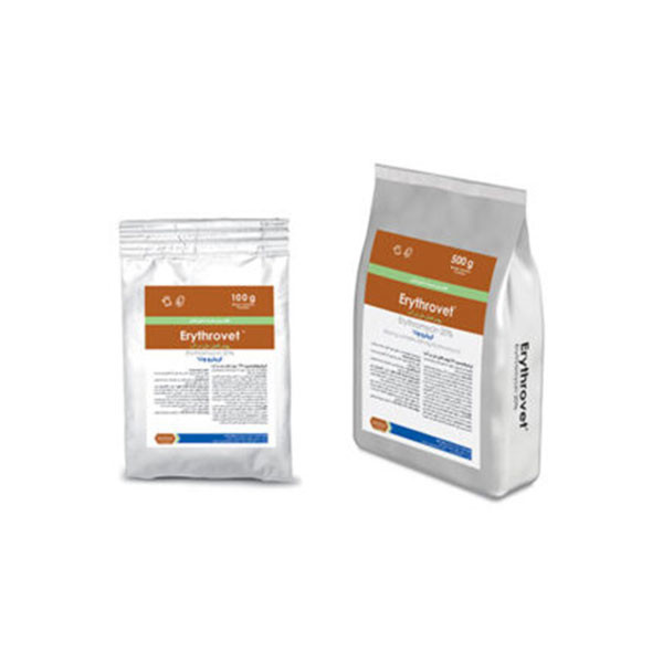 اریترووت | Erythrovet جهت درمان بیماری مزمن تنفسی (CRD) ناشی از عفونت های مایکوپلاسمایی، درمان عفونت های تنفسی حساس به اریترومایسین و بیماری های باکتریایی همچون استافیلوکوکوس اورئوس (آرتریت عفونی)، عفونت های کلستریدیایی، اِوی باکتریوم پاراگالیناروم (کوریزای عفونی) و پاستورلا مولتوسیدا در طیور مورد کاربرد قرار می گیرد.