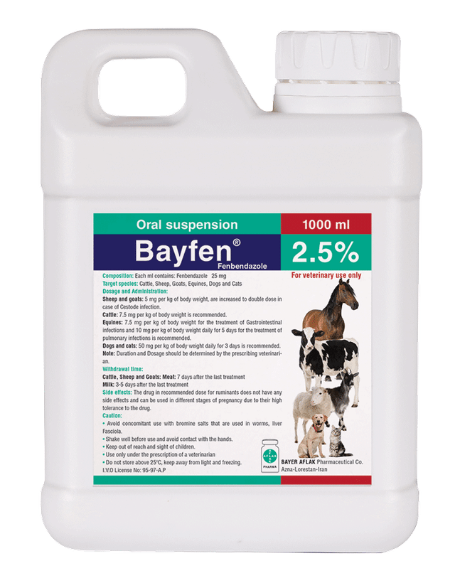 بای فن® 2/5% یک داروی ضد انگل وسیعالطیف است که بر روی تخم انگلها، مراحل مختلف نوزاد و بالغ نماتودهای دستگاه گوارش و تنفس مانند همونکوس، نماتودیروس، استرتاژیا، تریکواسترونژیلوس، کوپریا، ازوفاگوستوموم، شابرتیا اوینا، تریشوریس اویس و نئوآسکاریس در گاو، گوسفند و بز، همچنین سستودهای بالغ دستگاه گوارش و استرونگلهای بزرگ و کوچک، آسکاریس و اکسیوریس در تک سمیها و آسکاریس، آنکیلوستوما، تریشوریس و سستودهای بالغ در گوشتخواران مؤثر است.